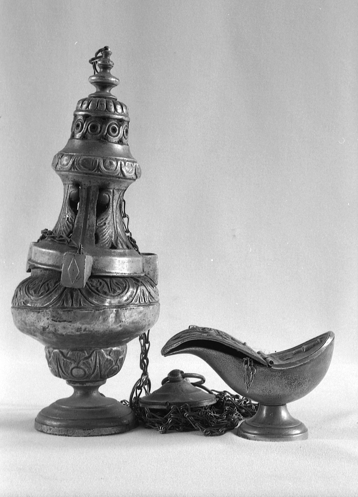 Encensoir en laiton, assemblages par coulissage sur trois chaînes ; navette en bronze.