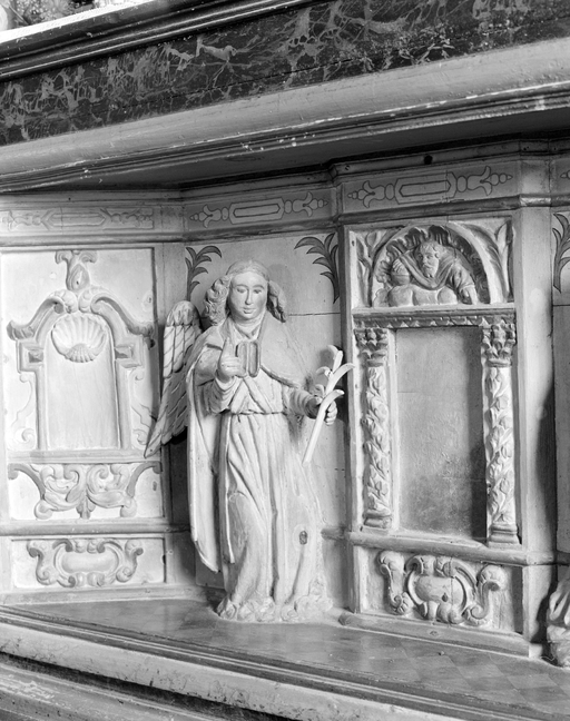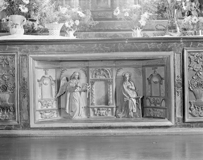 Oeuvre hétérogène composée d'éléments divers : ange de l'Annonciation 15e siècle et Vierge de l'Annonciation 17e siècle ; remploi d'éléments sculptés d'un tabernacle 17e siècle remontés au 18e siècle ; gradins du 18e siècle.
