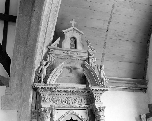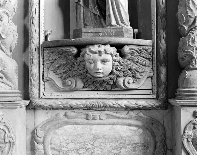 Eléments anciens remontés ; corniche centrale modifiée ; ailes de la console tronquées ; nez de la tête d'ange de la console restauré.