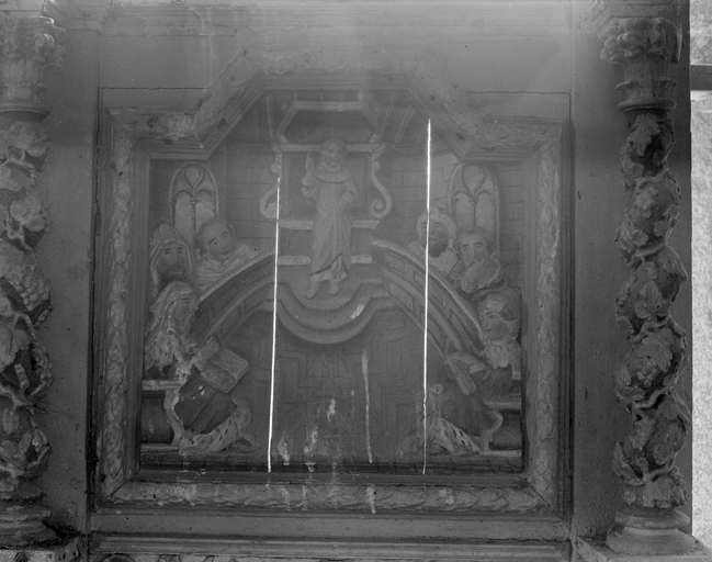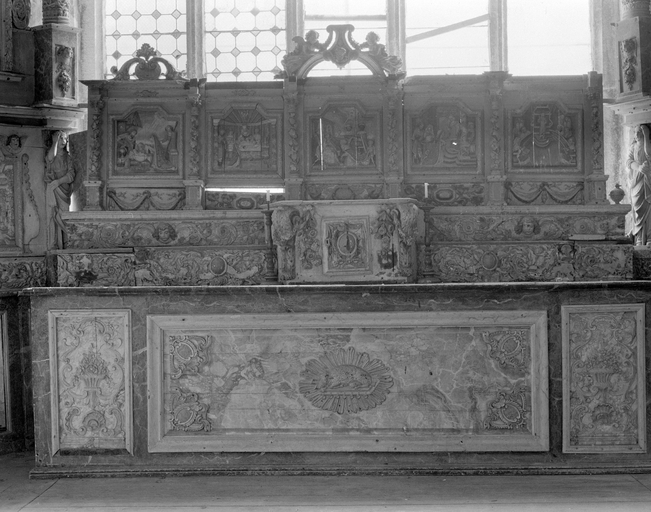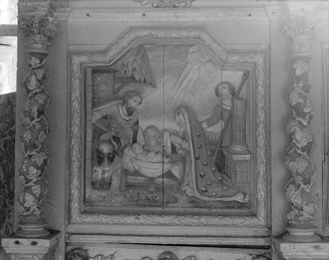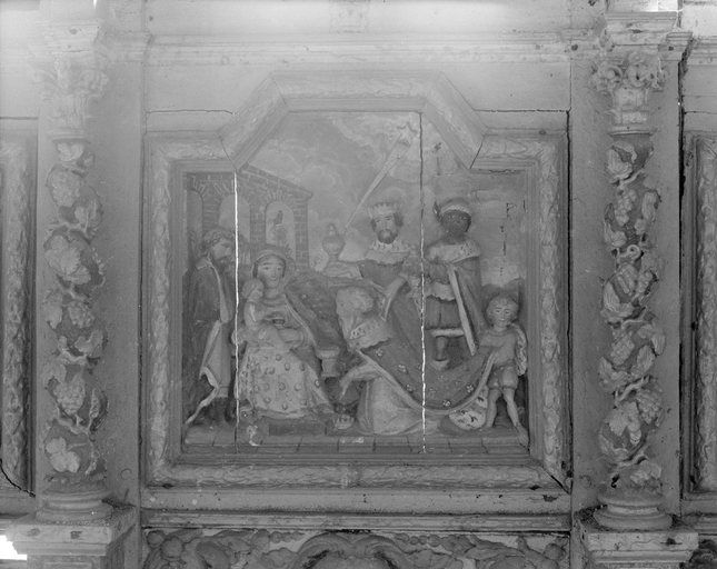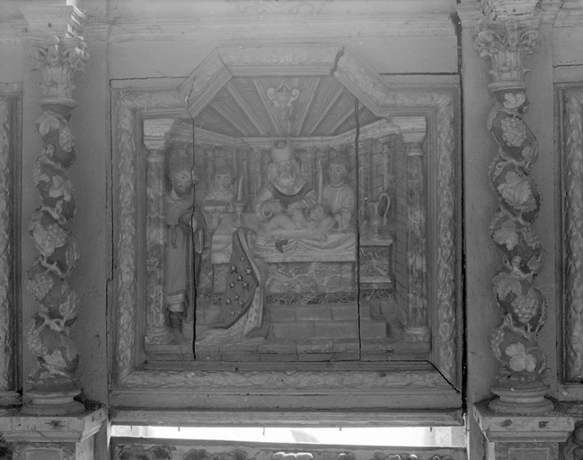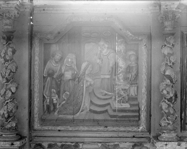 Autel de plan rectangulaire à élévation droite ; retable en trois parties constitué de panneaux historiés séparés par des colonnettes torses ; parties latérales panneaux historiés surmontés de niches encadrées de colonnes torses.