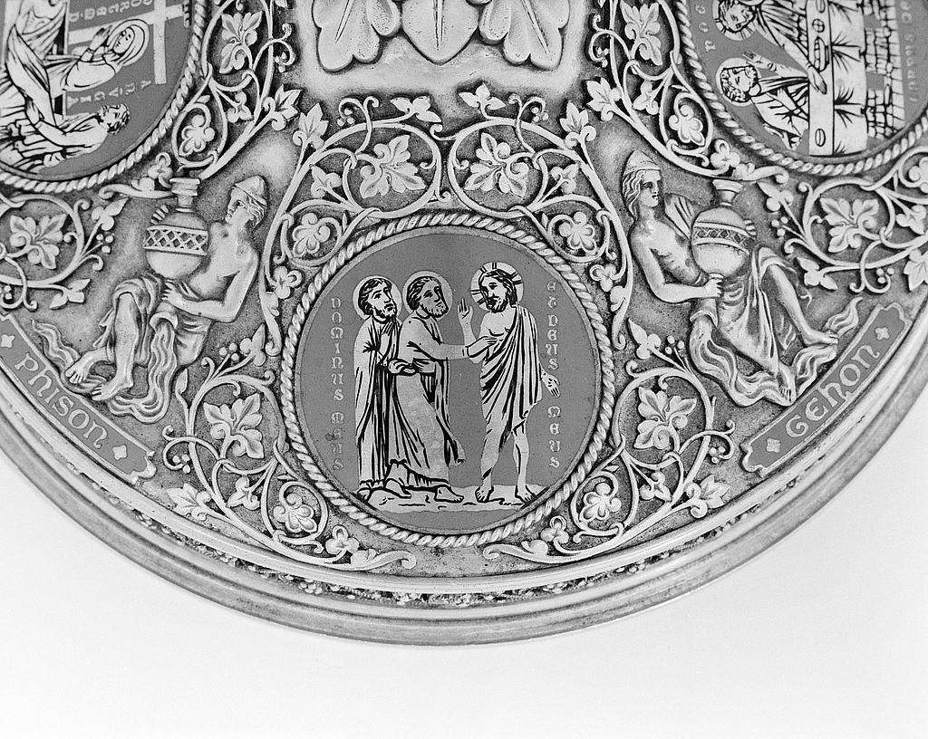 Sujet : représentation symbolique de plusieurs fleuves en alternance avec les médaillons du pied : tigris, phison, gehon, euphrates ; patène : croix fleuronnée dans un cartouche à 6 lobes reliant des fleurons internes.