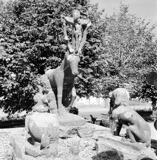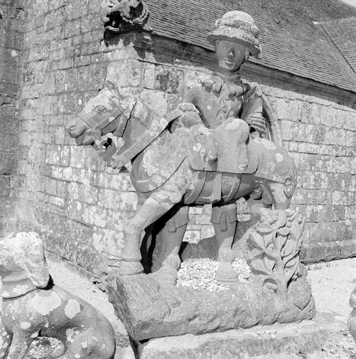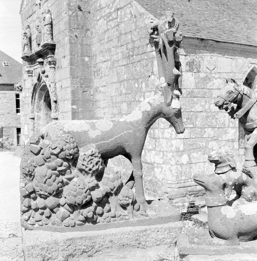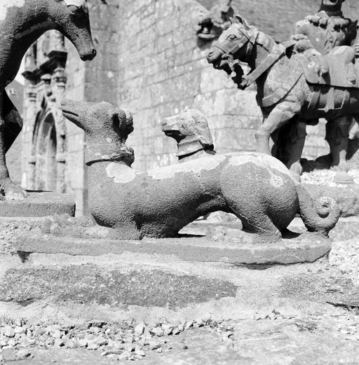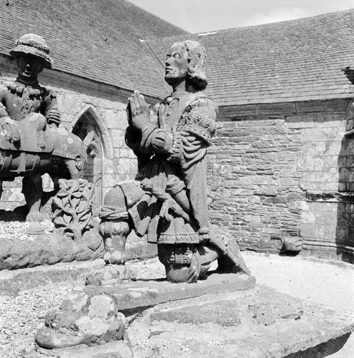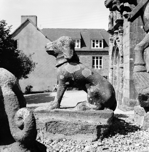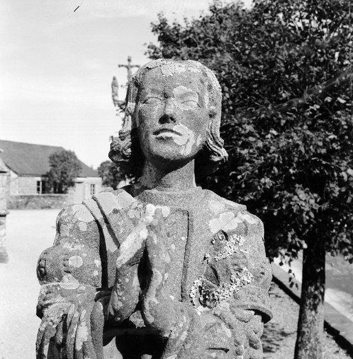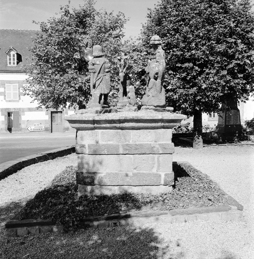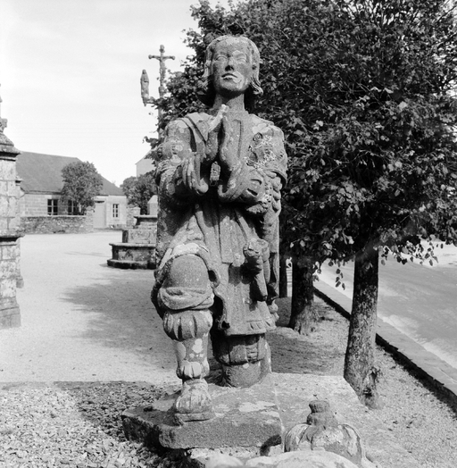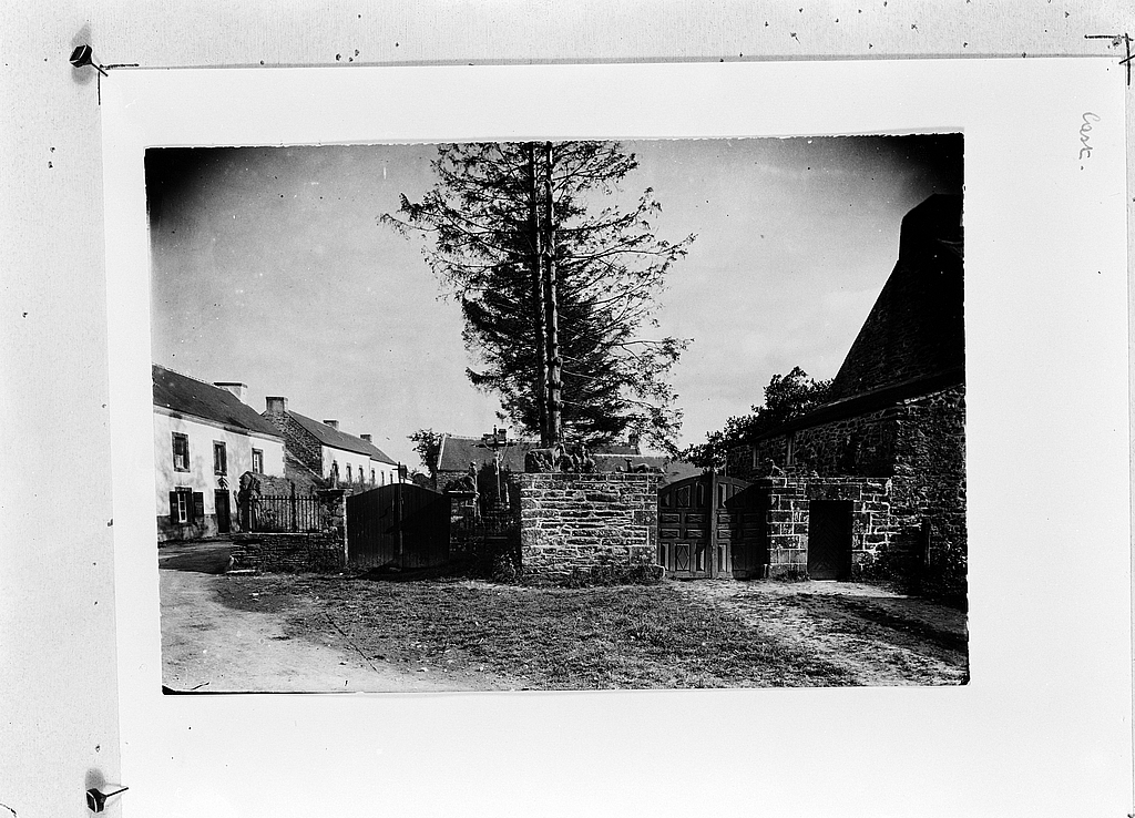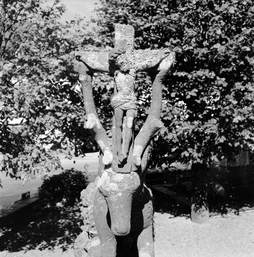 Une photographie du début du siècle nous permet de localiser l'oeuvre dans le jardin du presbytère ; seul un élément y est encore conservé : voir fiche 29001067.