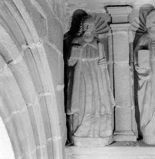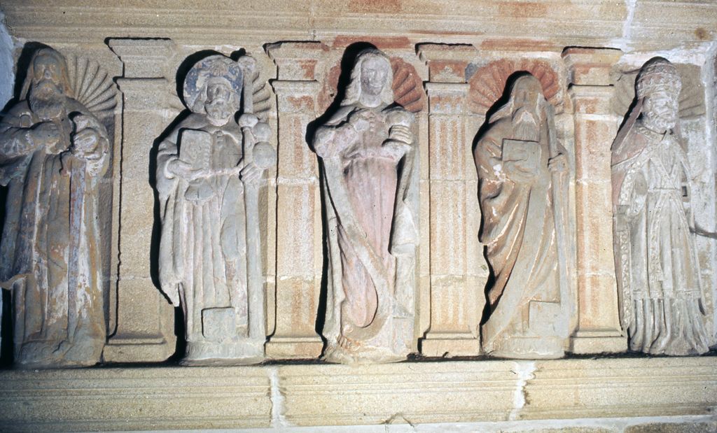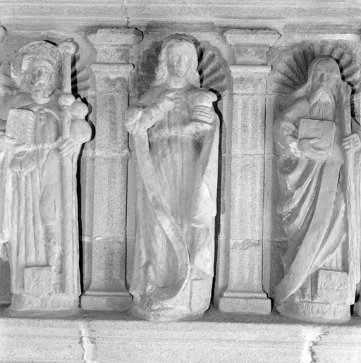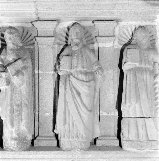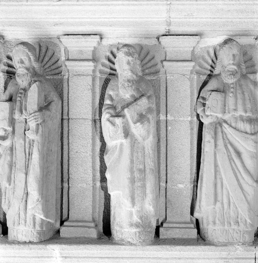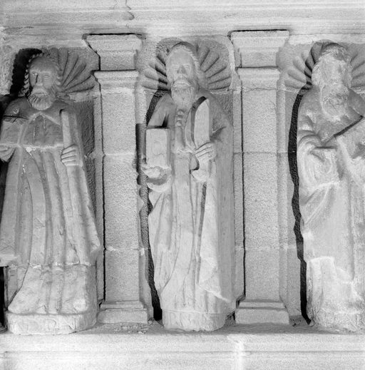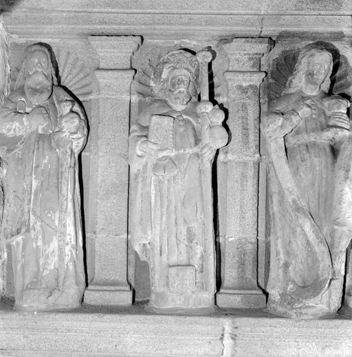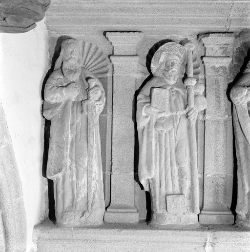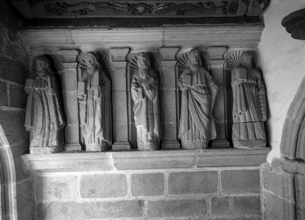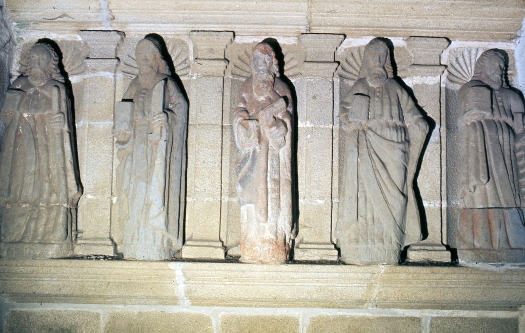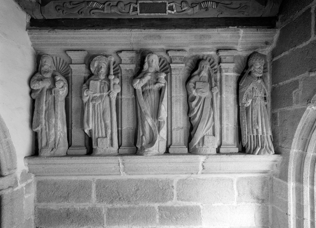 2 statues, en schiste, cassées : saint Simon et saint Jacques le Mineur ; fentes dans saint Barthélémy ; manque 3 statues.