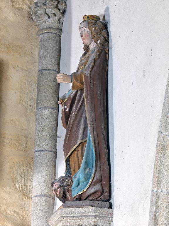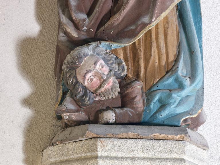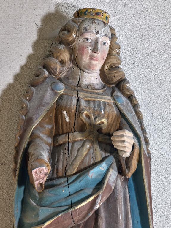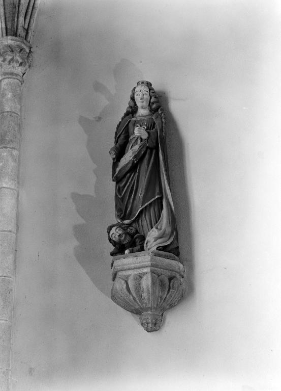 Sainte Catherine d'Alexandrie est représentée debout sur un homme, Maximilien comme surgissant de sa robe.