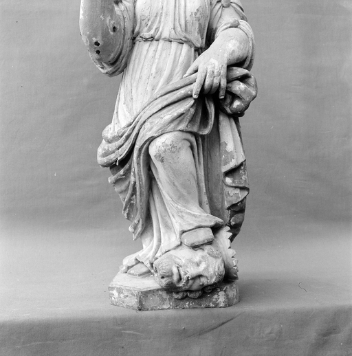 Sainte Catherine d'Alexandrie est représentée debout la jambe gauche repliée et posée sur la tête couronnée de Maximilien son bourreau. En arrière de la tête de ce dernier se trouve la roue du supplice.