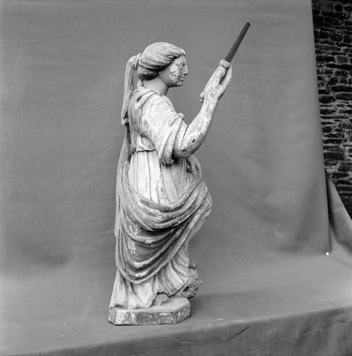 La sainte porte une robe plissée et ceinturée à la taille. Elle retient sur sa gauche un manteau drapé en travers de ses jambes. Ce dernier est disposé en arrière des épaules et retenu par deux broches circulaires et une bride plate. Les manches de la robe sont aussi retenues en deux endroits sur les épaules par des broches dévoilant les avant-bras de la figure. Elle ne porte pas de couronne, ses cheveux sont coiffés en larges rouleaux de part et d'autre du visage comme une grande partie des représentations datées du 17e siècle.