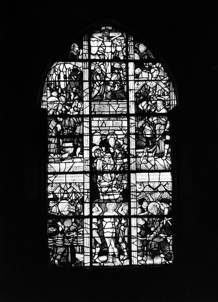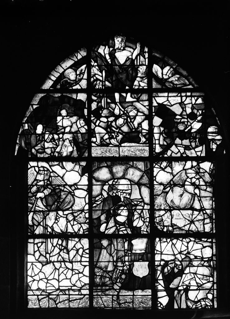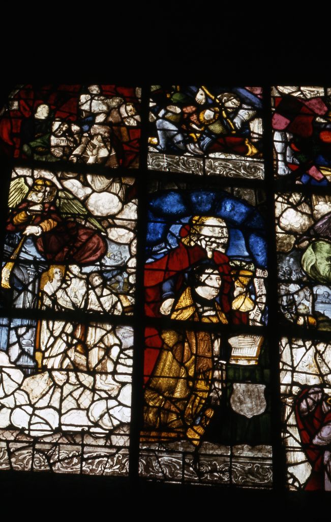 Description : dans les 2 registres supérieurs axiaux la résurrection du christ, ailleurs éparpillés des fragments de la résurrection des morts, au centre rompant une certaine symétrie un abbé donateur à genoux..