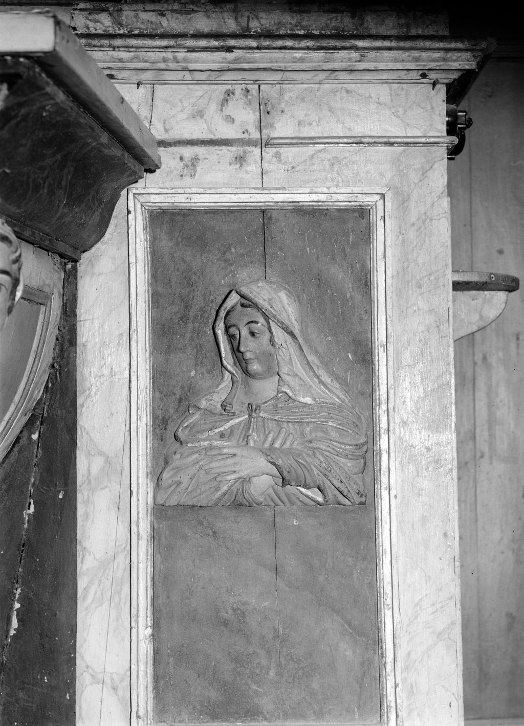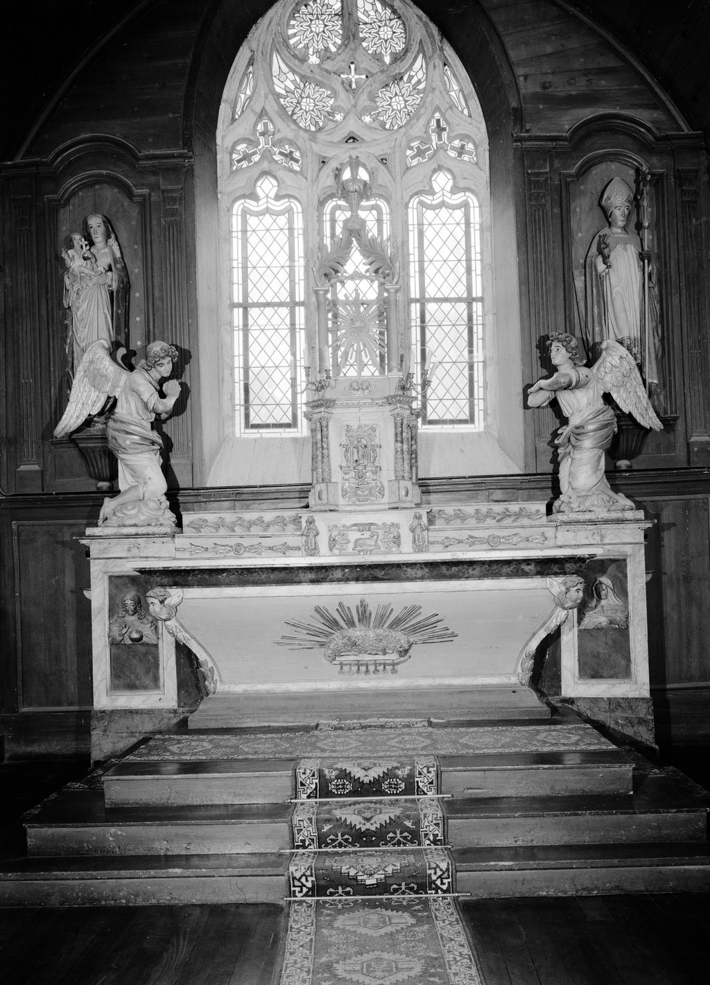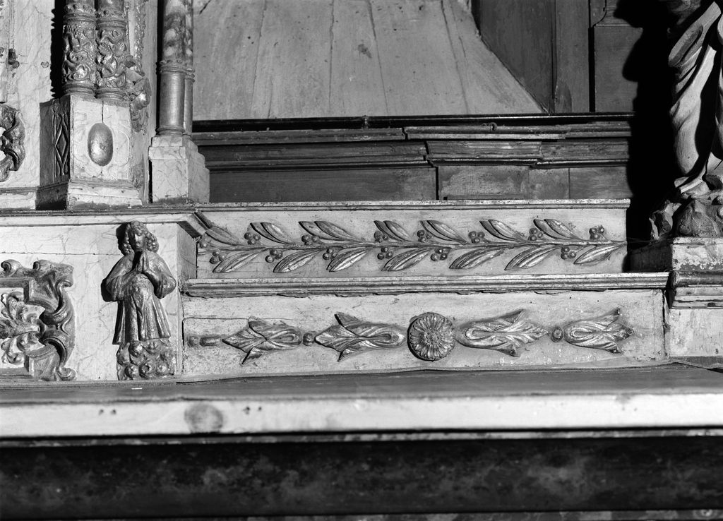 Description : les bustes du christ et de la vierge en demi-relief sur les piédestaux, la trinité en bas-relief sur la face antérieure du tabernacle, l'agneau mystique aux sept sceaux sur l'antependium.