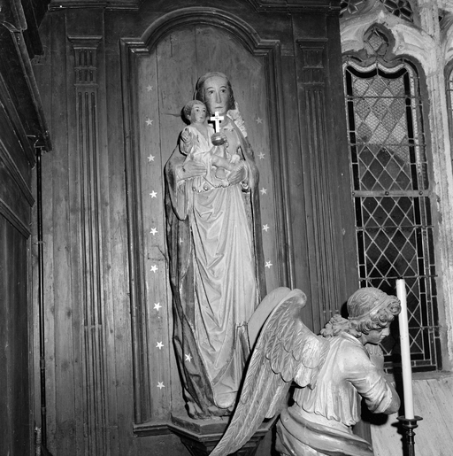 Statue de la Vierge à l'Enfant du 16e siècle (?) ; réplique presque exacte de la statue de Notre-Dame-de-Bonne-Nouvelle à Quimperlé, seuls les traitements des mains et des visages se distinguent (plus affinés à Quimperlé).