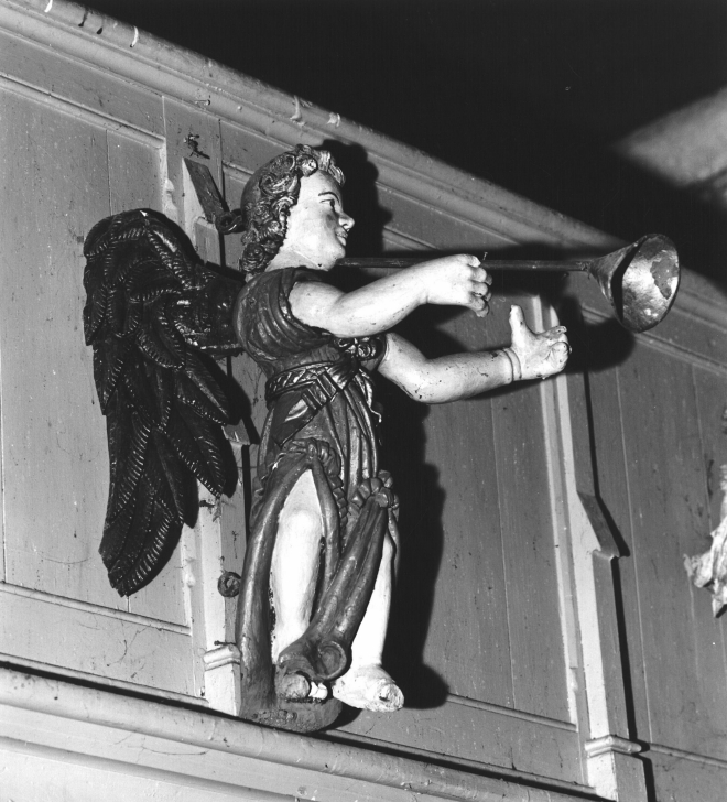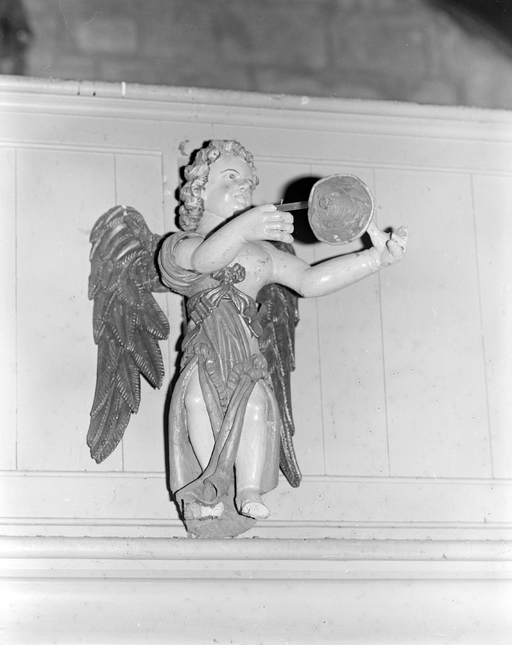 Ancienne figure d'ornement de la chaire à prêcher ; membres mutilés.