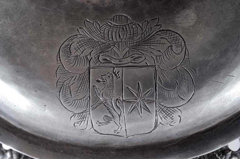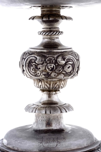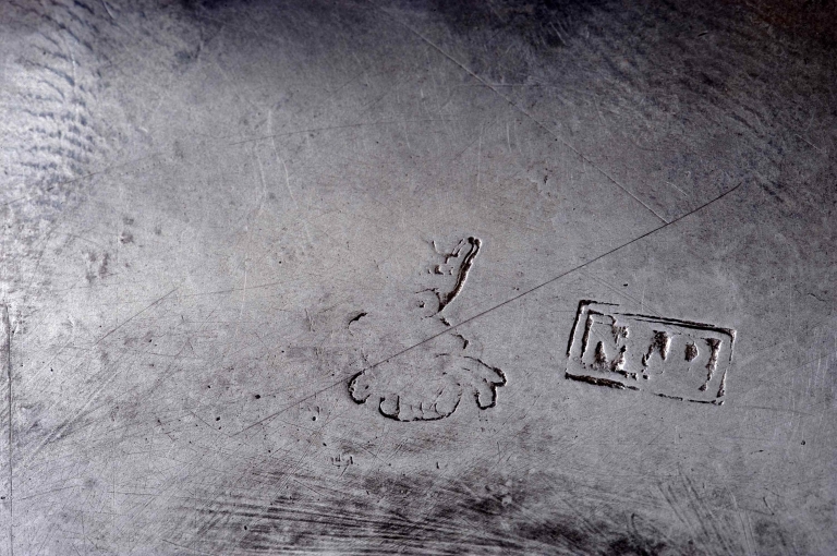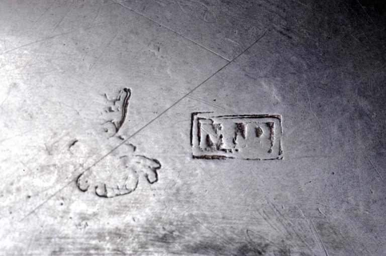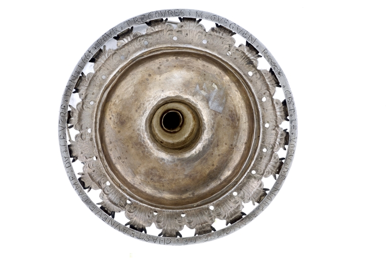 Poinçons (sous le pied) : initiales M et B séparées par un point, dans un cadre rectangulaire, maître Mathurin Boullemer ; communauté de Rennes année 1661, hermine passante, lettre R au dessus, et lettre M au dessous. Inscription, gravée sous la bordure du pied : C'EST LE VOEU DE NOB FRANCOISE DE CHASTEAUNEUF DAME DU LEVZRE L'AN1661 POUR TREGOUREZ M GUEGVVEN R.