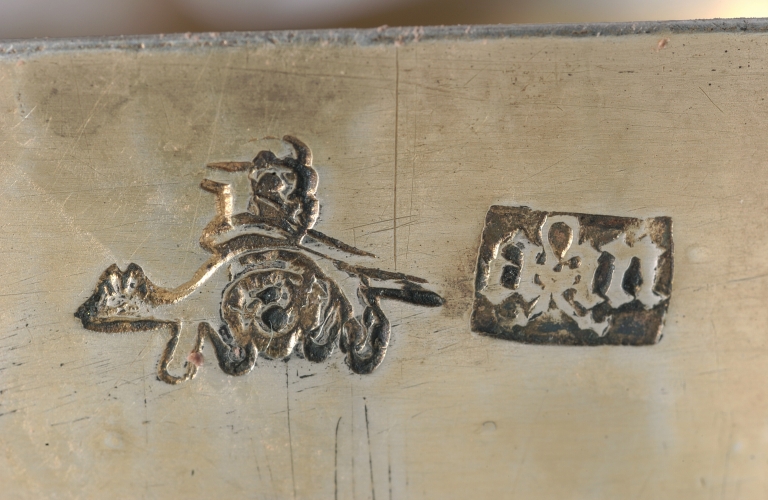 Poinçons (sur le haut de la coupe) : poinçon de ville : hermine passante, lettre C entre les pattes, au dessus, lettre R, communauté de Rennes ; poinçon de maître : lettres minuscules gothiques A et M, séparées par un lacet dont le noeud est en forme de coeur, maitre Alain Maillart. Armoiries (sur les boutons carrés du noeud) : un semis d'hermine, famille ducale de Bretagne.