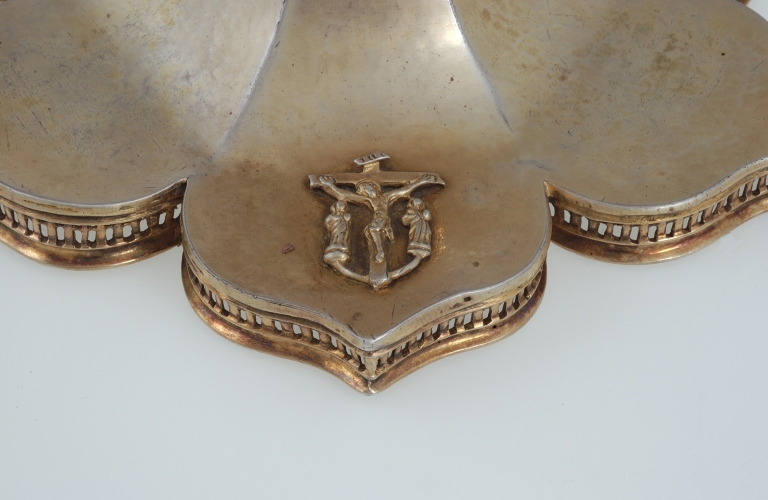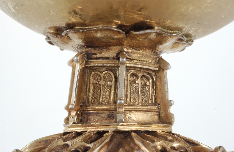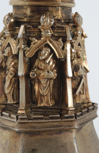 Pied à six lobes en accolade, sans ressaut. Base de la tige à six pans avec arcatures abritant des figuriens d'apôtres. Nœud orné de boutons carrés posés sur la pointe. Noeud et personnages fondus ; pied et coupe repoussés ; languettes du pied à la tige rabattues et soudées ; bordure du pied estampée ; sommet de la tige gravée ; boutons du noeud gravés et émaillés.