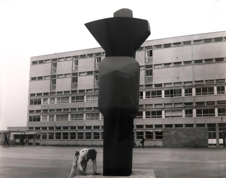 3°) M. Gilioli : Dans la cour, en façade du Lycéen un sculpture de 5 m de hauteur environ composée d'éléments aux formes géométriques et qui serait en tôle peinte de trois couleurs.