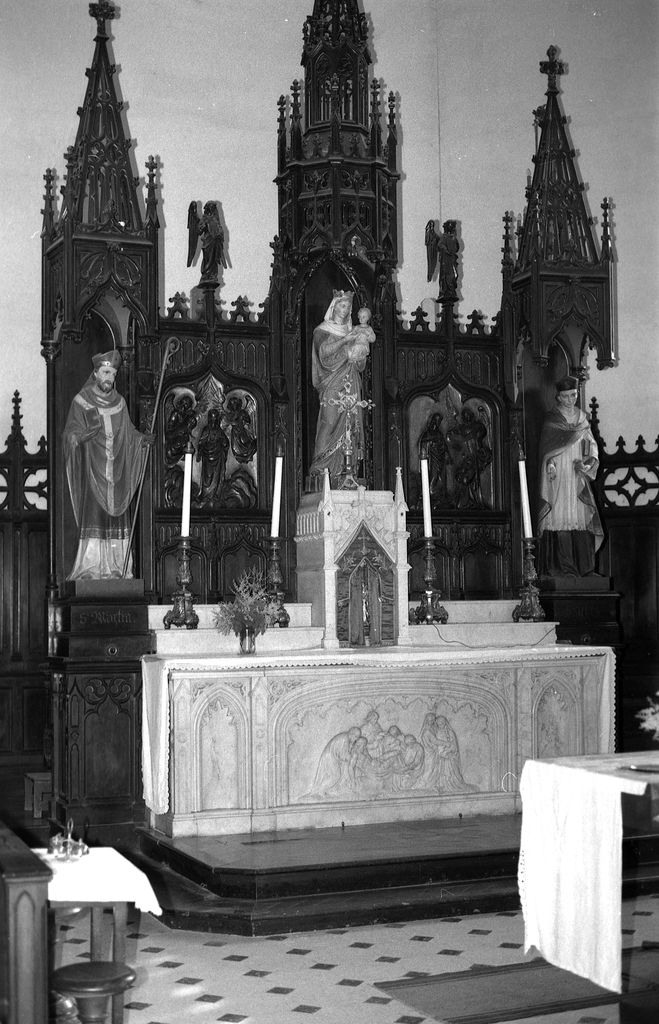 Décor néo-gothique ; autel sud orné de statues en plâtre de saint Martin, saint Joseph et l'Enfant et saint Jean Evangéliste ; autel nord orné de statues en plâtre de sainte Anne et la Vierge, la Vierge et l'Enfant, une sainte non identifiée portant deux flèches à la main.