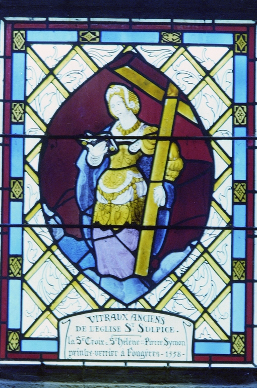 Inscription sous la scène de la résurrection : RESURREXIT SICUT DIXIT ALLELUIA ; inscription sous les fragments remontés : CH. J.M.C.D./DON DE LA FAMILLE E.P ; N/VITRAUX ANCIENS DE L'EGLISE ST SULPICE. LA SAINTE CROIX DE STE HELENE : : PIERRE SYMON PEINTRE ; VERRIER A FOUGERES ; 1558 ; DON DE MME PETEL ; DEMORAND/DON DE LA FAMILLE ROUSSIN ; VAN RICKSTAL/A.A.ALLEAUME PTRE VERRIER AN 1926. JUILLET.