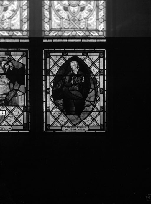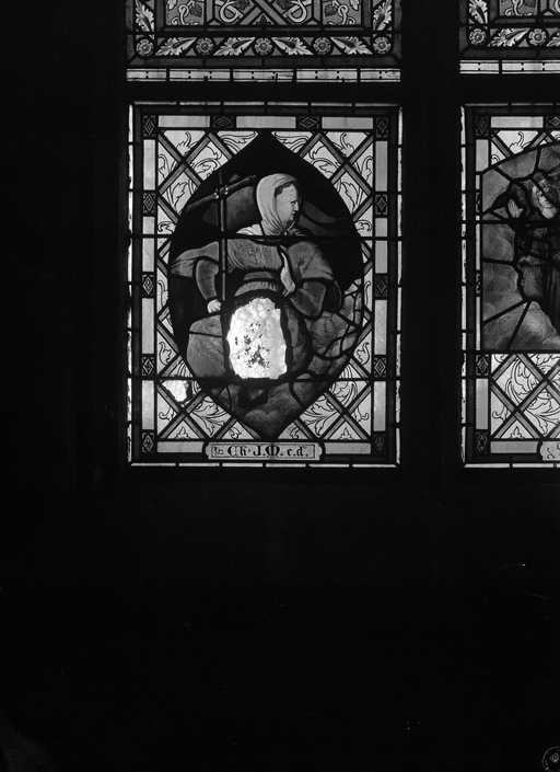 Verrière composite, formée de fragments anciens (attribués à Pierre Symon, 1558, par une inscription sur la verrière) et remontés dans une verrière signée A.A. Alleaume, peintre-verrier lavallois, datée de juillet 1926.