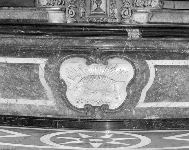 Marbre rouge de saint Berthevin ; marbre noir de Solesmes ; tour eucharistique en bois polychrome et doré.