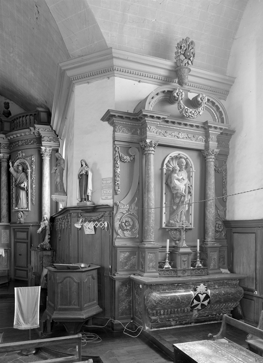Autels de plan rectangulaire et élévation en talon ; l'autel nord est en bois, l'autel sud en marbre de Saint-Berthevin (près de Laval), noir veiné rouge, inscrusté d'un médaillon circulaire de marbre noir lui-même incrusté d'une croix ancrée blanche. Le retable architecturé à une travée comporte une niche encadrée de deux colonnes accostées d'aileron, supportant un entablement à fronton cintré brisé et un pot à fleurs.