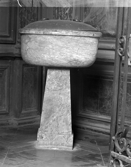 Le baldaquin de bois, soutenu par 4 pilastres cannelés, abrite des fonts baptismaux de marbre. La clôture qui ferme l'encoignure est en fer forgé.