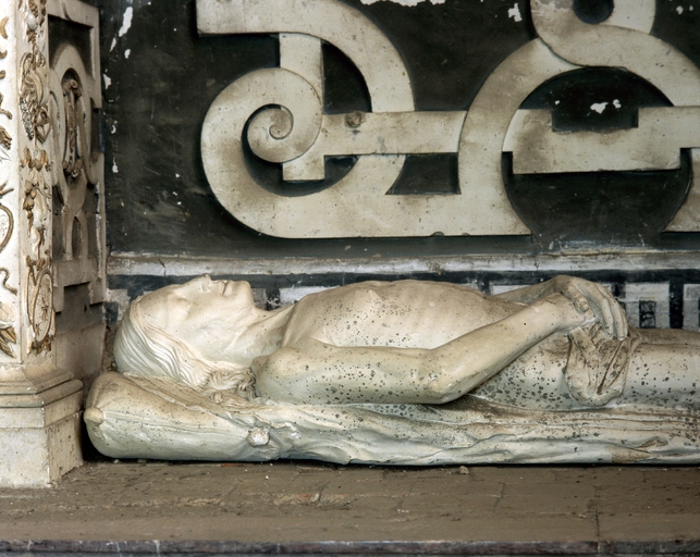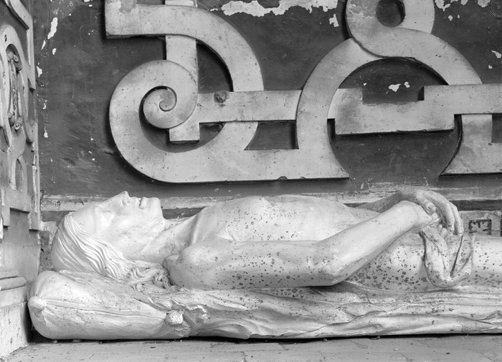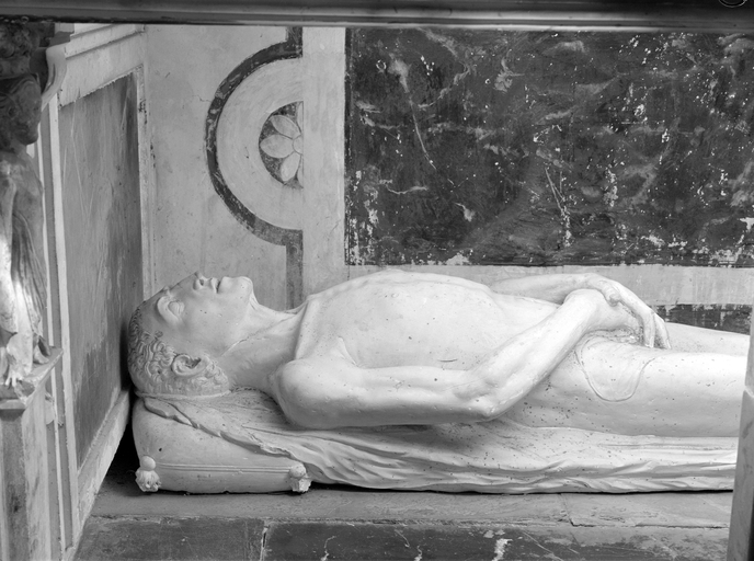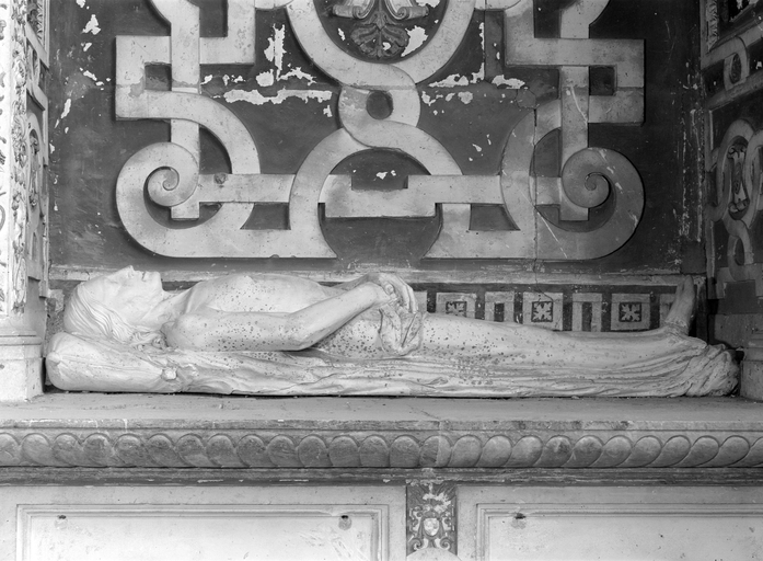 Gisants réalisés en 1553 (décès de Guy d' Epinay) et 1567 (décès de Louise de Goulaine) prévus pour occuper, côte à côte la niche inférieure du tombeau construit en 1553. Depuis la disparition des priants qui occupaient la niche supérieure jusqu' à la Révolution, les gisants ont été répartis entre les deux emplacements, celui du mari en bas, celui de la femme en haut.