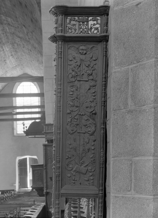 Stalles réalisées probablement vers 1530, suite au mariage de Guy d' Epinay et de Louise de Goulaine en 1528 dont on devine les armoiries en alliance sans doute bûchées à la Révolution ; ces stalles ont été remontées au cours du 18e siècle lors du réaménagement du choeur et la suppression de l'ancien jubé qui leur était associé dans un ordre qui ne semble pas respecter l'alternance originelle ; légères restaurations en 1921 par Victor Pasquet et Norbert Le Floch de Vitré.