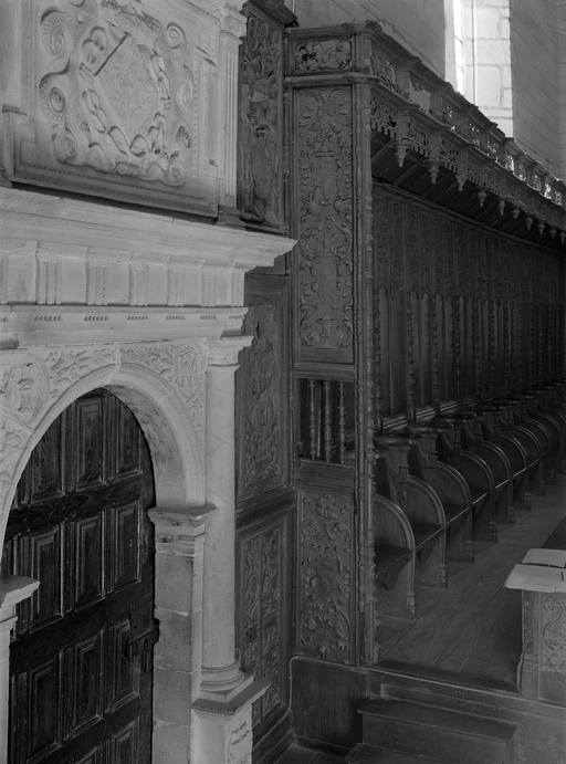 Armoiries identifiées d'Epinay et de Goulaine (mi parti de France et d'Angleterre) sur les joues et dans le registre inférieur du dossier des stalles. Inscription concernant une restauration gravée sur la face supérieure de la corniche du dais des stalles sud.