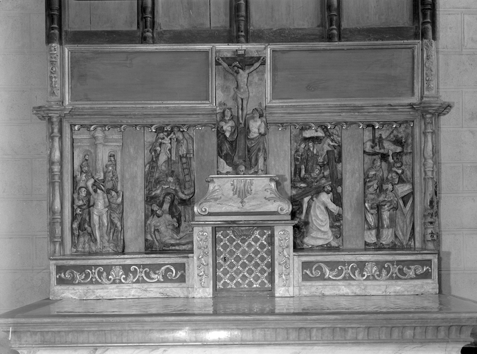 Retable, baldaquin et prédelle du 2e quart 16e siècle ; remplois probables d' éléments de l'ancienne clôture fermant le choeur, en accord avec les stalles. Autel, gradin et tabernacle du 2e quart 18e siècle. Cette dernière date correspond au remontage du retable et de la prédelle dont l'ordre des panneaux a été mal restitué ainsi qu' au décor peint sous le dais.