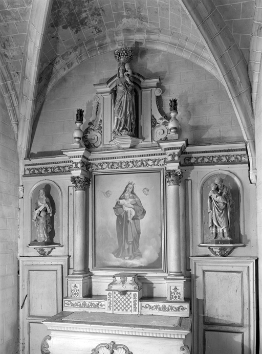 Autel, retable, degré d'autel (autel secondaire, retable architecturé à niche), dit de la Vierge, ancienne collégiale, actuellement église Sainte-Marie-Madeleine (Champeaux),