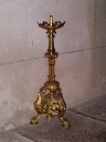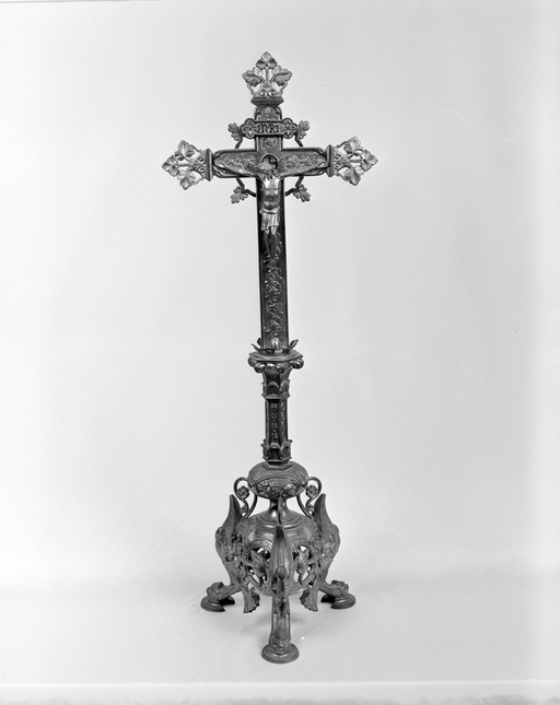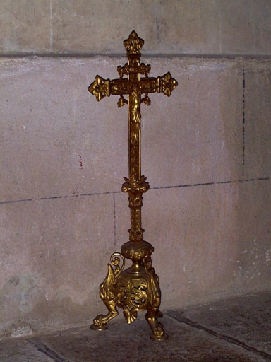 - Cette croix d'autel forme avec un ensemble de 6 chandeliers une garniture de style néogothique qui pourrait mériter une étude.