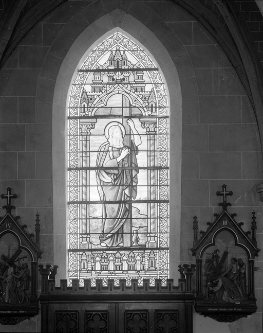 La verrière de la baie 7 représentant sainte Madeleine a été exécutée dans l'atelier rennais des maîtres verriers Lecomte et Colin en 1881.