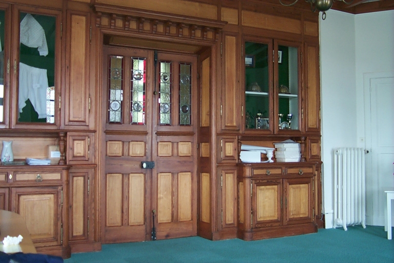 Ensemble de meubles réalisés pour la salle à manger de la villa Sauffroy construite en 1883 ; il comporte deux placards-buffets vitrés, à deux corps, disposés de part et d'autre de la porte d'entrée de la pièce dont les vantaux sont garnis de panneaux vitrés à rondels peints ainsi que d'une cheminée à lambris architecturé.