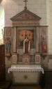 Les culots inférieurs des ailes sont arrachés ; manque le motif décoratif (coeur enflammé) du tympan. Le tableau d'autel a été retiré et remplacé par une tenture derrière la statue de la Vierge.