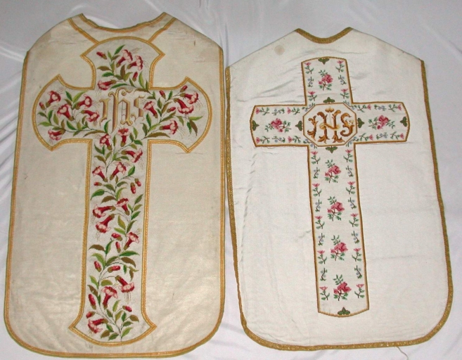 Ornement blanc 4 : Chasuble : soie (blanche) : tissu façonné, application sur textile, tapisserie au point, polychrome. Oeuvre déposée ; le tissu est taché ; il manque tous les accessoires. 1er quart 20e siècle. Représentation : I.H.S. ; ornementation végétale. Fig. 32.