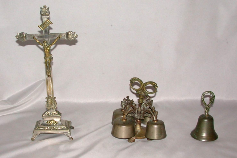 Sonnette d´autel : métal : fondu, chromé, doré ; 18 h. La dorure a pratiquement disparu. 4e quart 19e siècle. Représentation : tête d´animal ; lancette. Fig. 12.