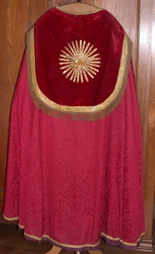 Chape 5 : soie (rouge) : tissu façonné, velours uni, application sur textile, adjonction d´élément ; fil métal : doré. Oeuvre déposée ; le velours est usé. 1e quart 20e siècle. Représentation : colombe du Saint-Esprit ; rayons. Fig. 28, 29.