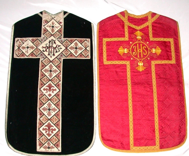 Ornement rouge 3 : Chasuble, bourse du corporal, étole : soie (rouge) : tissu façonné, brodé, polychrome, application sur textile. Oeuvre déposée ; il manque le voile de calice et le manipule. 1er quart 20e siècle. Représentation : I.H.S. ; ornementation végétale. Fig. 33.