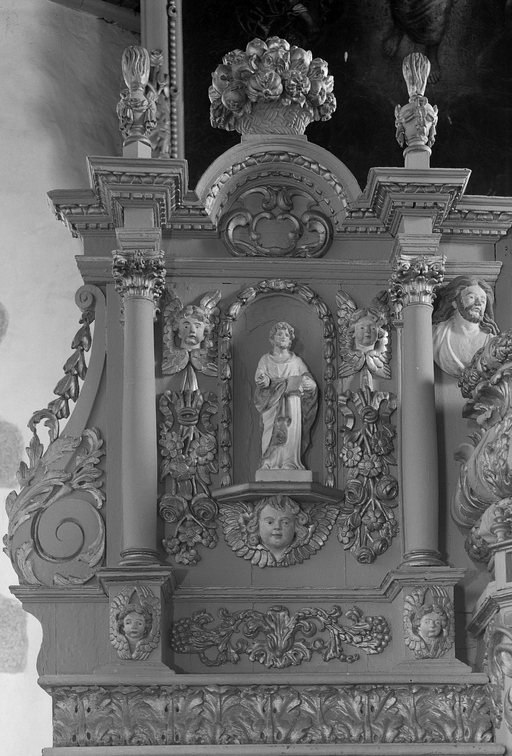 Autel supporté par une plinthe rectangulaire. Les flancs forment un arc de cercle. Trois rangées de gradins d'autel. Le tabernacle : le premier étage est octogonal avec une porte en plein cintre. Le second est aussi octogonal, à flans en doucine, avec porte centrale évidée pour recevoir une statuette. Les 2 étages sont séparés par une petite balustrade à fuseaux. 2 fuseaux sur la partie supérieure du second étage. Le retable : 2 corps symétriques composés d'une niche centrale. 2 colonnes fuselées à stylobates et chapiteaux corinthiens. Large corniche à modillons. Pots à fleurs au sommet. Enroulements sur les côtés.