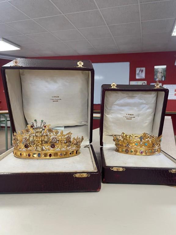Les deux couronnes, l'une pour la Vierge et l'autre pour l'Enfant Jésus, sont en or et sont incrustées de perles et de pierres précieuses ou semi-précieuses. Elle sont conservées dans un coffret portant la marque de l'orfèvre et marchand Emile Evellin.