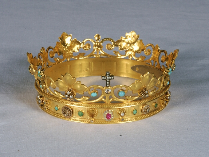 Egalement ouverte, la couronne du Christ présente aussi une petite croix frontale ornée de perles. Les fleurons sur le pourtour du bandeau affectent la forme de feuilles de vigne. L'ensemble est enrichi de pierres précieuses ou semi-précieuses dont l'hétérogénéité laissent penser qu'elles ont été offertes par divers donateurs ou donatrices.