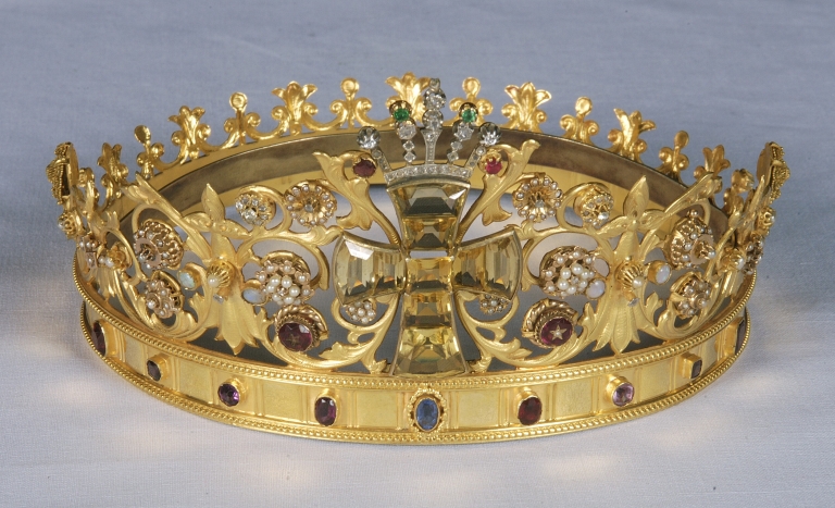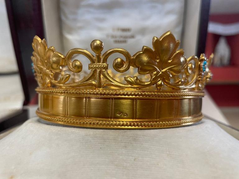La couronne ouverte de la Vierge se caractérise par une grande croix frontale ornée de pierres de couleur orangée. De part et d'autre, deux fleurons en forme d'hermine se déploient dans un élégant réseau de rinceaux.