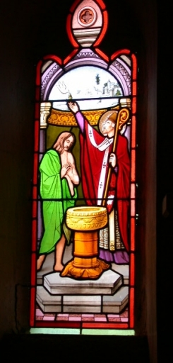 Verrières figurées baies 8, 10, 12 : Baptême du Christ, de Clovis et de Charlemagne ou saint Louis,