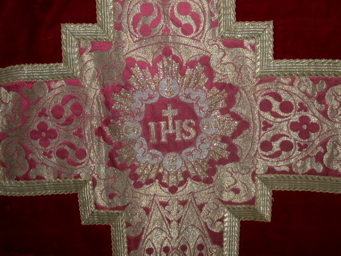 Sur le dos de la chasuble : I.H.S., lancette, ornementation, croix.