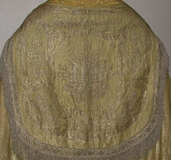 Sur le chaperon : I.H.S. rayonnant, ornementation, représentation végétale.