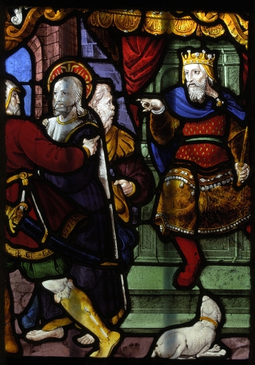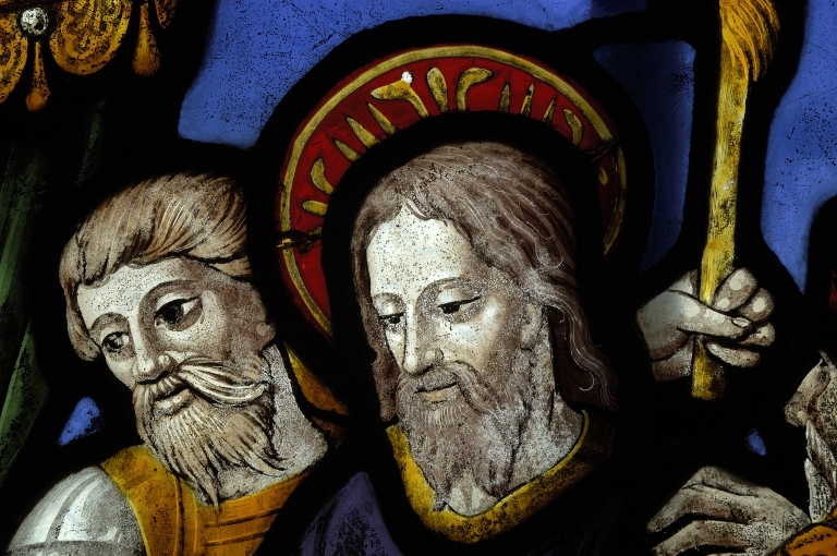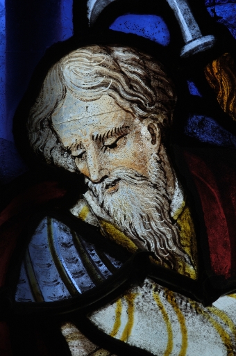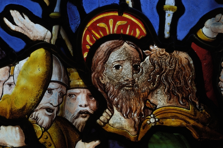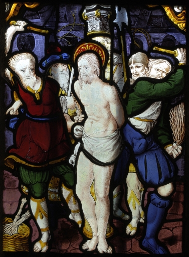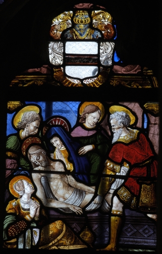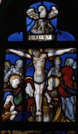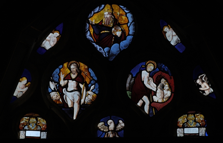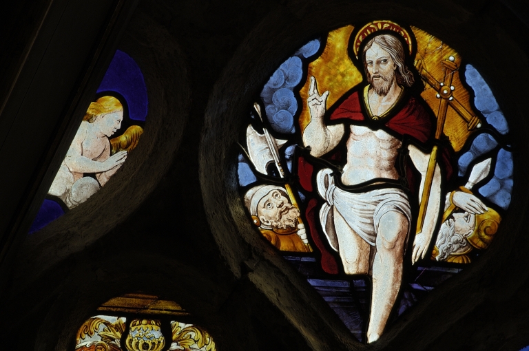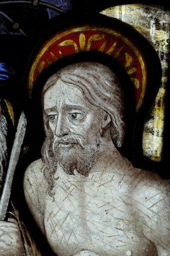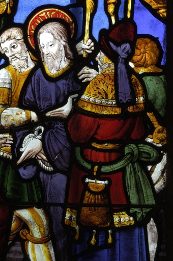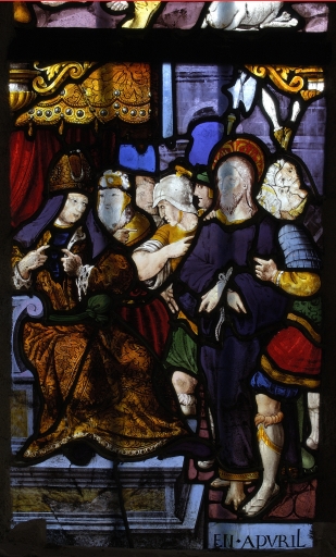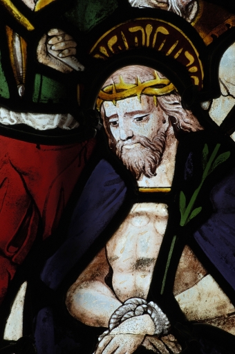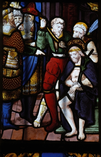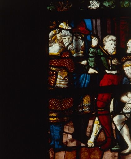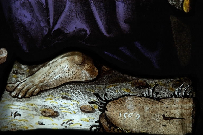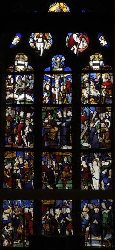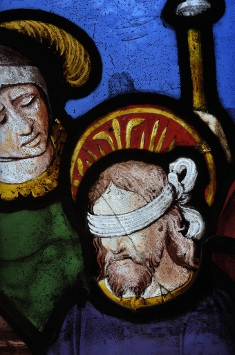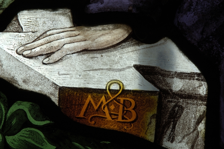 Lancette gauche, 3e scène à partir du bas : BAIONE dans le galon inférieur du vêtement du personnage de gauche. Lancette centrale, 1ère scène en bas dans l'angle inférieur droit, inscription incomplète : EN APVRIL ; 2e scène à partir du bas, inscription sur le galon du vêtement du soldat à gauche : [MB..] F[E]CIT - LA [..] EVIT MA[..] ; 3e scène à partir du bas : 1569 dans l´angle inférieur droit. Lancette droite, 3e scène à partir du bas, monogramme : MB sur la pierre sur laquelle s´appuie le Christ. Dans la partie supérieure des lancettes latérales, armoiries de la famille Du Bouays de Couasbouc : d'argent à la fasce de sable bordée de gueules, entourées du collier de Saint-Michel et surmontées d´un cimier à lambrequins.
