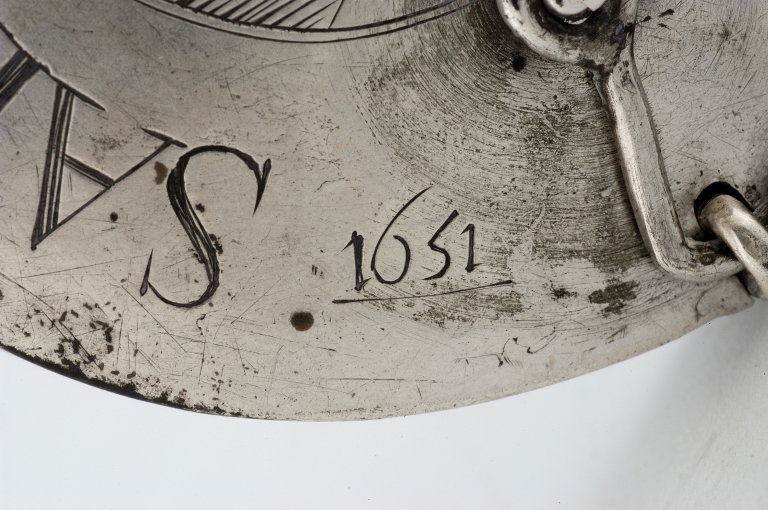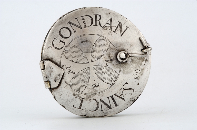 Le poinçon de maître est sur la tranche, près du crochet de fermeture ; il est pratiquement illisible. Inscription et date gravées sur le couvercle : SAINCT GONDRAN 1651 ; lettres sur chaque espace laissé libre par les branches de la croix : ME / I / L / B ; ces lettres se lisent dans le même sens que SAINCT GONDRAN, soit ME[ssire] I[ean] L[e] B[reton].