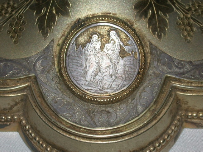 Sur le pied du calice : Nativité, Fuite en Egypte, Calvaire ; ailleurs : blé, vigne, roseaux, rinceaux.