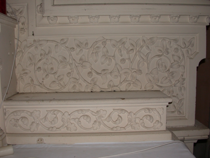 Devant d'autel : arcatures trilobées ; porte du tabernacle : croix, rinceaux ; gradin et retable : rinceaux de vigne.