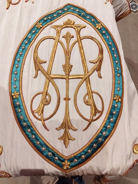 Il s'agit d'une bannière de petites dimensions, sans doute destinée aux jeunes filles. Elle porte d'un côté la représentation de la Vierge de l'Immaculée Conception et de l'autre les lettres A et M entrelacées ("Avec Maria").