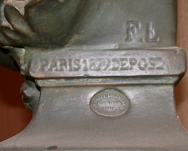 Signature en creux sous l'épaule gauche : F. F (en miroir et renversé). Sur la plinthe, marque en creux : PARIS 1872 DEPOSE. Sur le piédouche, marque ovale en creux : SAMUEL LUCCHESI / [illisible] / PARIS / Rue de la Roquette 96.